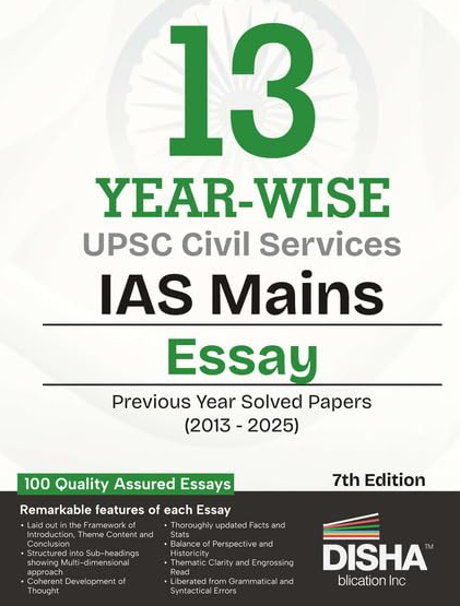 The updated 7th Edition of 13 Years UPSC Civil Services IAS Mains ESSAY Year-wise Solved (2013 – 2025) consists of Past 13 years Solved Papers of the IAS Mains Paper 1 – Essay in Year-wise format.